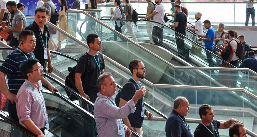 (240426) -- BEIJING, April 26, 2024 (Xinhua) -- Purchasers are pictured during the 135th session of the China Import and Export Fair in Guangzhou, south China's Guangdong Province, April 24, 2024. As of 5:00 p.m. on Tuesday, a total of 172,901 purchasers from 214 countries and regions have physically attended the 135th session of the China Import and Export Fair, commonly known as the Canton Fair, an increase of 21.6 percent over the same period last year. (Xinhua/Liu Dawei)