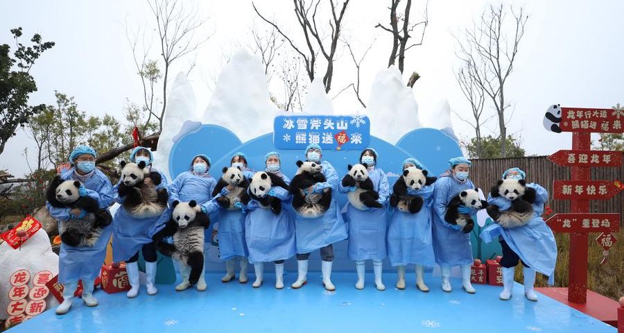 (240206) -- CHENGDU, Feb. 6, 2024 (Xinhua) -- Staff members hold giant panda cubs during a group appearance event at the Chengdu Research Base of Giant Panda Breeding in Chengdu, southwest China's Sichuan Province, Feb. 2, 2024. A total of 34 giant panda cubs were bred by China Conservation and Research Center for Giant Panda and Chengdu Research Base of Giant Panda Breeding in 2023. (Chengdu Research Base of Giant Panda Breeding/Handout via Xinhua)