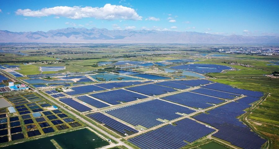 Foto aérea tirada em 24 de agosto de 2021 mostra painéis fotovoltaicos em uma base de criação de peixes no distrito de Helan, em Yinchuan, Região Autônoma da Etnia Hui de Ningxia, no noroeste da China. (Xinhua/Wang Peng)