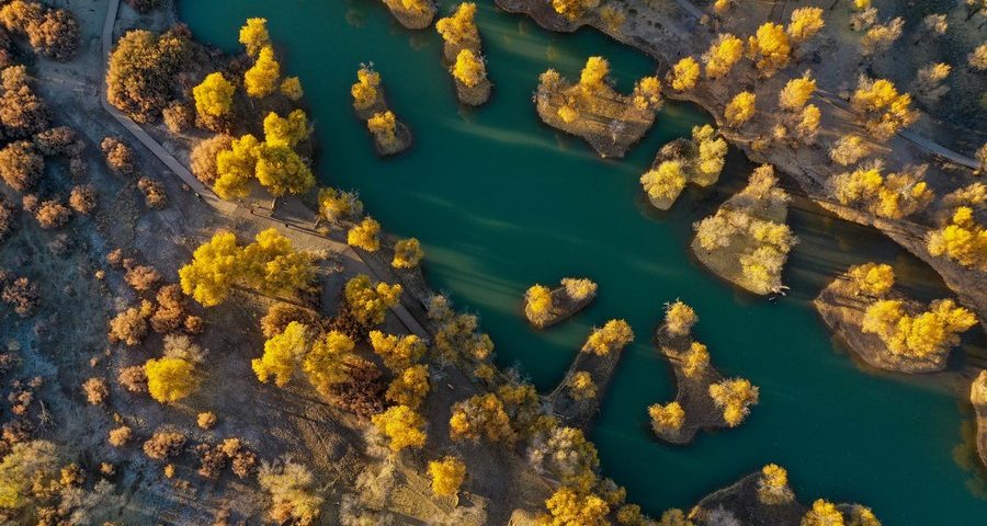 Apelidada como fóssil vivo de plantas, as árvores populus euphratica nas áreas desérticas são conhecidas por sua vitalidade – tolerância à seca e resistência ao sal e alcalinidade.