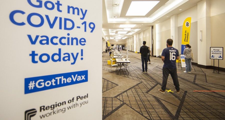 As pessoas fazem fila para entrar em uma clínica de vacinação no Centro Internacional em Mississauga, Ontário, Canadá, em 13 de maio de 2021. (Xinhua/Zou Zheng)