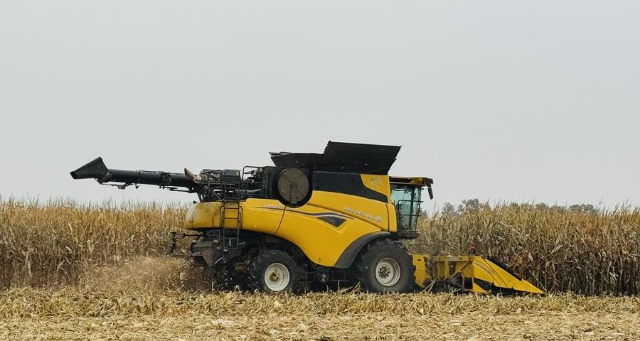 (251016) -- HARBIN, Oct. 16, 2025 (Xinhua) -- A harvester produced by the Case New Holland (CNH) works in a corn field in Shuangcheng District of Harbin, northeast China's Heilongjiang Province, Oct. 14, 2025. TO GO WITH "Economic Watch: Global agribusiness giants optimistic about China's agricultural modernization" (Xinhua/Sun Xiaoyu)