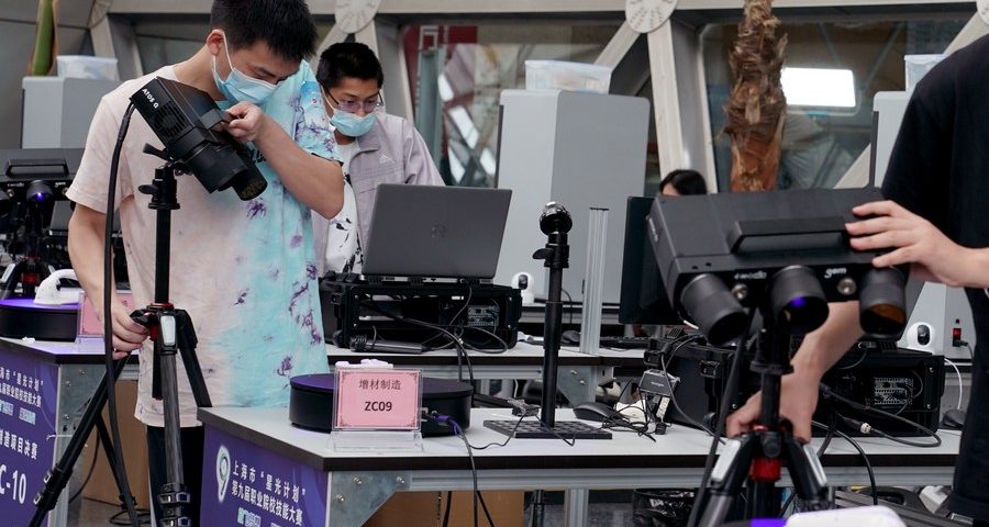 Os alunos participam de um concurso de manufatura aditiva durante uma competição de habilidades de estudantes vocacionais em Shanghai, leste da China, em 8 de maio de 2021. (Xinhua/Liu Ying)