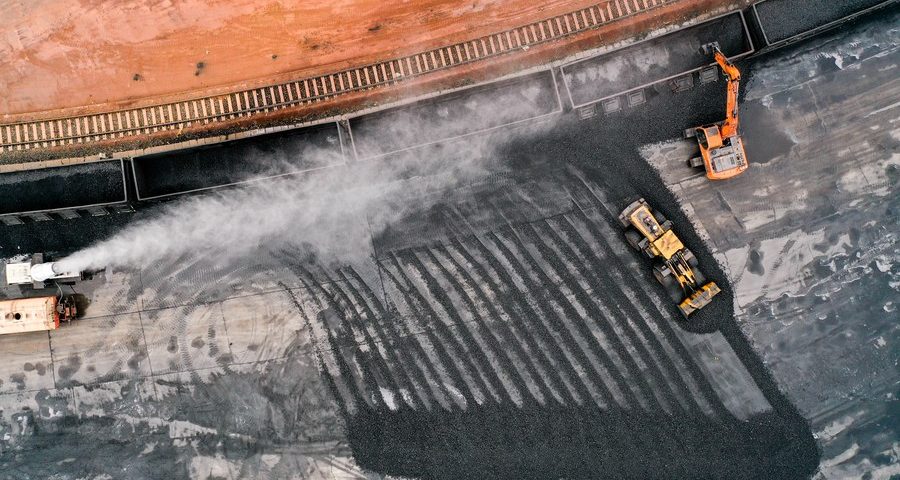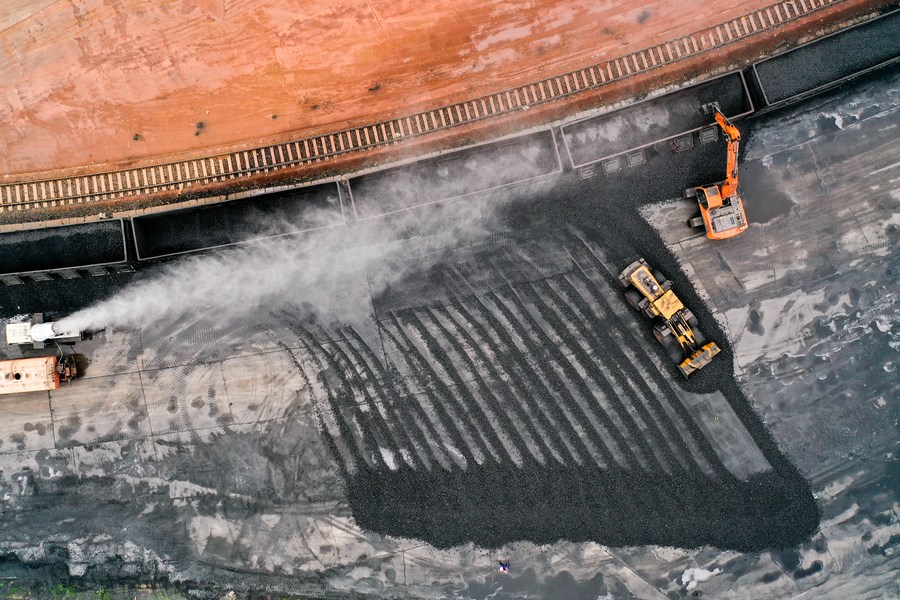 Veículos descarregando coque de trem sob medidas de controle de poeira em pátio de logística em Qian'an, Província de Hebei, cidade importante da indústria siderúrgica no norte do país, com grande demanda de transporte de matérias-primas como minério de ferro, carvão e coque. (Arquivo/Xinhua/Mu Yu)