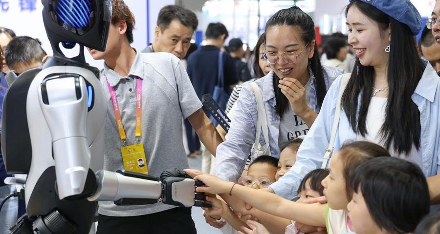 (250907) -- CHONGQING, Sept. 7, 2025 (Xinhua) -- Visitors interact with a home service robot during the World Smart Industry Expo 2025 in southwest China's Chongqing Municipality, Sept. 6, 2025. The World Smart Industry Expo 2025 kicked off on Friday in southwest China's Chongqing Municipality, showcasing advanced achievements including AI rehabilitation systems, portable wearable devices, elderly care robots, and senior-friendly equipment. (Xinhua/Chen Cheng)
