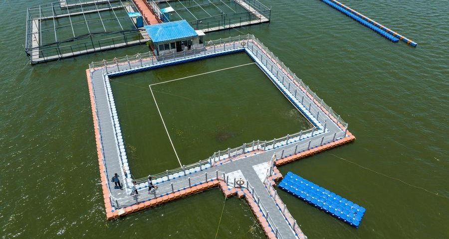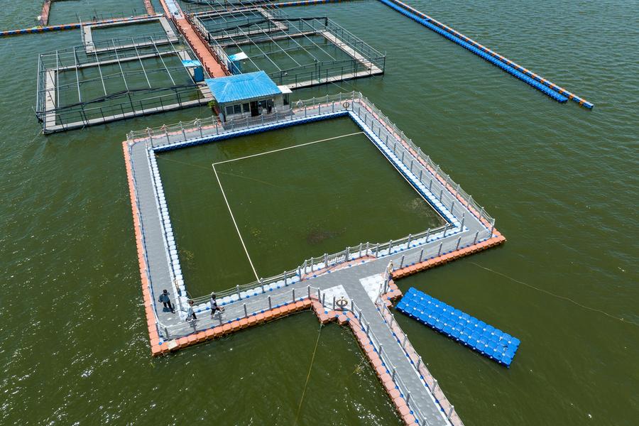 (230727) -- WUHAN, July 27, 2023 (Xinhua) -- This aerial photo taken on June 27, 2023 shows staff members of the Institute of Hydrobiology, the Chinese Academy of Sciences working at the Yangtze River Swan Island Baiji Dolphin National Nature Reserve, central China's Hubei Province. Three generations of researchers at the Institute of Hydrobiology, the Chinese Academy of Sciences (CAS) have spent decades rescuing and nursing endangered species - the Baiji dolphin and the Yangtze finless porpoise. The latter is dubbed the "smiling angel of the Yangtze River" as its slightly curly lips resemble those of a smiling person. Baiji dolphin Qi Qi passed away in July 2002 after living for more than 22 years at the Baiji Dolphin House under CAS Institute of Hydrobiology in Wuhan. There was no more Baiji dolphin at the house after Qi Qi's death, but the house and the Wuhan Baiji Conservation Foundation kept their names unchanged. Researchers there decided to apply protective measures designed for Baiji dolphins to their "cousins" - Yangtze finless porpoises. Eleven Yangtze finless porpoises are now raised at the Baiji Dolphin House, four of which were bred in artificial environments. China has also established a number of in-situ and ex-situ reserves for these aquatic mammals, and the finless porpoises living there, about 150 in total, are capable of natural reproduction. On April 25, 2023, four Yangtze finless porpoises ex-situ protected at the Yangtze River Swan Island Baiji Dolphin National Nature Reserve were released in batches into the Xinluo and Shishou sections along the main stream of Yangtze River, which successfully completed the last key link in the closed loop of protection technology system for Yangtze finless porpoises. Data from the Yangtze Finless Porpoise Expedition 2022 across the whole Yangtze River basin showed their population had reached 1,249, a historic "rebound." Hao Yujiang, an associate researcher at the CAS Institute of Hydrobiology, served as the group leader for Yichang-Chenglingji section during the expedition in 2022. "We could see more green along the Yangtze River, the river bank looked more natural, and there were more fish in the water," he said, adding, "We are also more optimistic that these 'smiling angels' would have a better future." (Xinhua/Wu Zhizun)