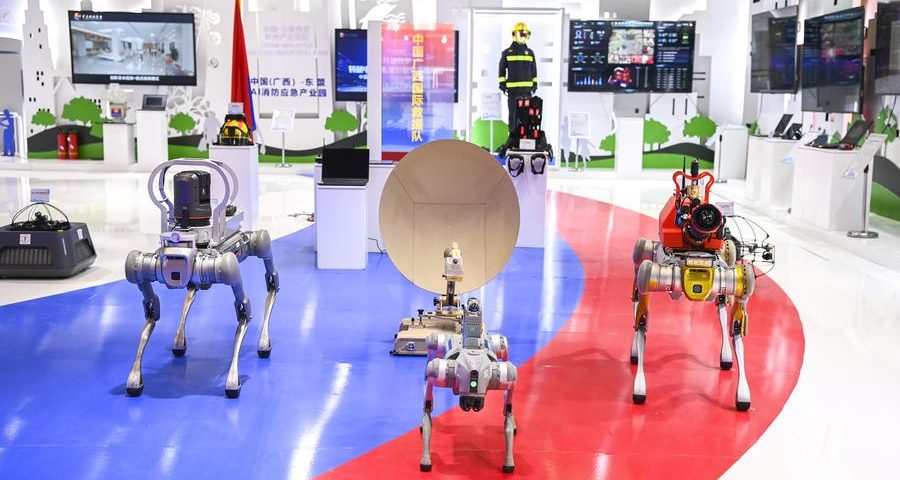 (250918) -- BEIJING, Sept. 18, 2025 (Xinhua) -- AI-powered firefighting devices are seen at Nanning International Convention and Exhibition Center in Nanning, capital of south China's Guangxi Zhuang Autonomous Region, Sept. 17, 2025. The 22nd China-ASEAN Expo and the China-ASEAN Business and Investment Summit kicked off here on Wednesday. (Xinhua/Cao Yiming)