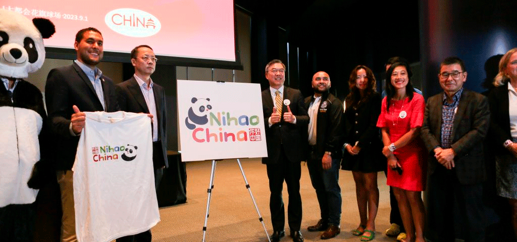 O logotipo tem um panda gordinho de desenho animado, as letras coloridas de “Nihao China” e um selo tradicional de Nihao Zhongguo em caracteres chineses.