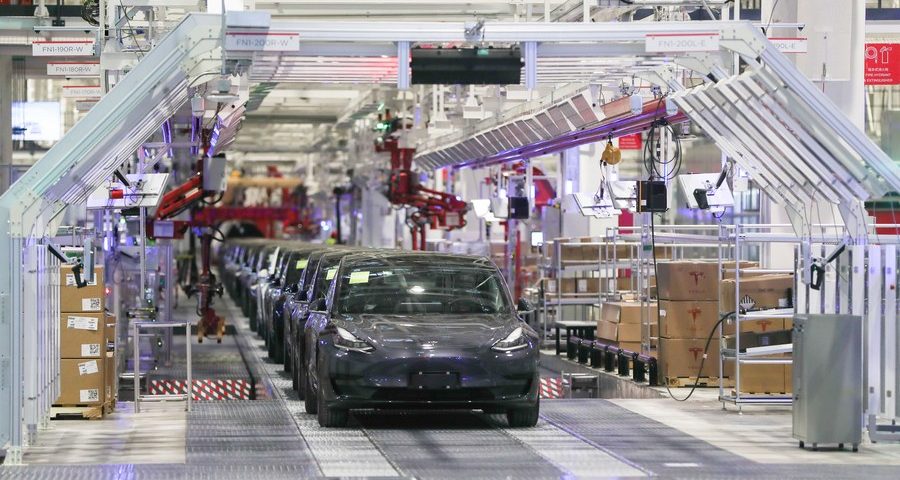 Foto tirada em 7 de janeiro de 2020 mostra sedãs produzidos pela China na gigafábrica da Tesla em Shanghai, leste da China. (Xinhua/Ding Ting)