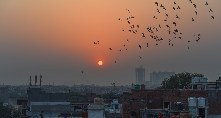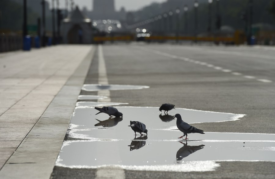 Pombos bebem água em uma rua durante um dia quente de verão em Nova Deli, Índia, 15 de maio de 2023. Foto: Javed Dar