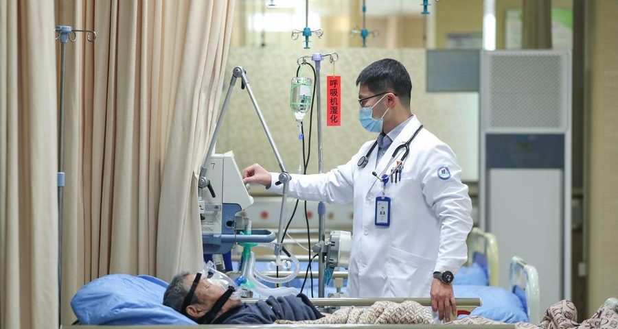 (240102) -- BEIJING, Jan. 2, 2024 (Xinhua) -- A doctor tends a patient at a hospital in Shenyang, northeast China's Liaoning Province, Jan. 2, 2024. (Xinhua/Long Lei)