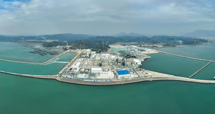 (250103) -- BEIJING, Jan. 3, 2025 (Xinhua) -- An aerial panoramic photo taken on Jan. 1, 2025 shows a view of the Zhangzhou nuclear power project under construction in Zhangzhou, southeast China's Fujian Province. The first power generation unit of China National Nuclear Corporation's Zhangzhou nuclear power project in southeast China's Fujian began commercial operation on Wednesday, marking a major step forward in the batch construction process of Hualong One, a domestically developed third-generation reactor. (Zhangzhou nuclear power project/Handout via Xinhua)