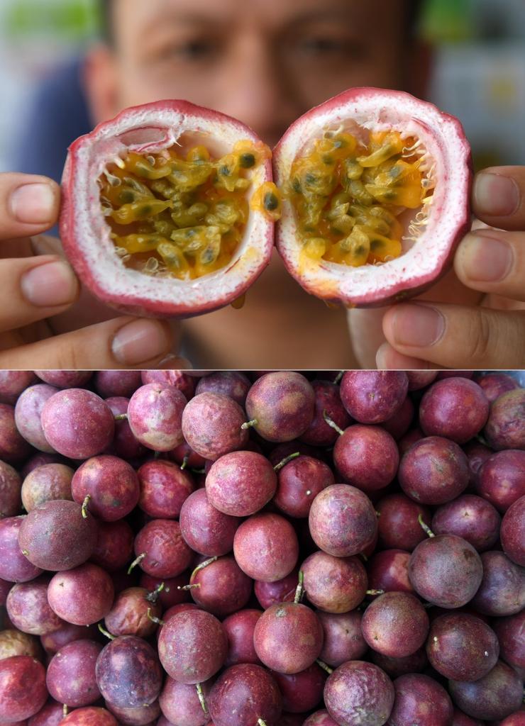 Foto de combinação tirada em 17 de setembro de 2019 mostra um exibidor demostrando maracujá durante uma feira de comércio de produtos agrícolas no distrito autônomo da etnia Yao de Du'an, na Região Autônoma da Etnia Zhuang de Guangxi, sul da China. (Xinhua/Lu Boan)