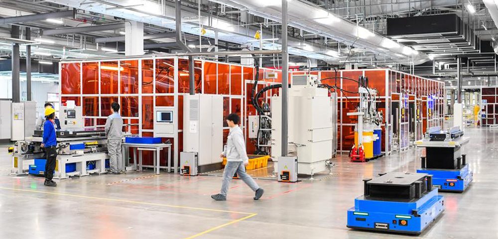 (240203) -- CHANGCHUN, Feb. 3, 2024 (Xinhua) -- This photo taken on Feb. 2, 2024 shows a battery production facility in Changchun, capital of northeast China's Jilin Province. The battery production facility co-invested by China's leading automaker First Automotive Works (FAW) and leading new-energy vehicle (NEV) manufacturer BYD were put into operation on Friday in Changchun, capital of northeast China's Jilin Province. TO GO WITH "FAW, BYD-backed battery production project operational" (Xinhua/Xu Chang)