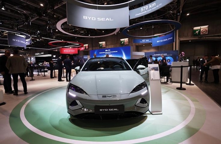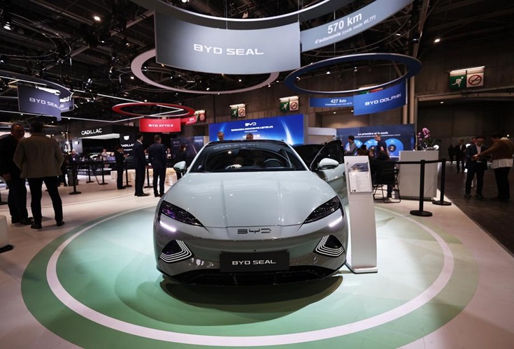 (241015) -- PARIS, Oct. 15, 2024 (Xinhua) -- People visit the pavilion of Chinese carmaker BYD at the 2024 Paris Motor Show during the media day in Paris, France, Oct. 14, 2024. The 2024 Paris Motor Show kicked off here on Monday, which is expected to attract 500,000 visitors over its seven-day run. Nine Chinese electric vehicle (EV) manufacturers showcased their latest models at the show as they seek to expand their presence in the French and wider European markets. (Xinhua/Gao Jing)