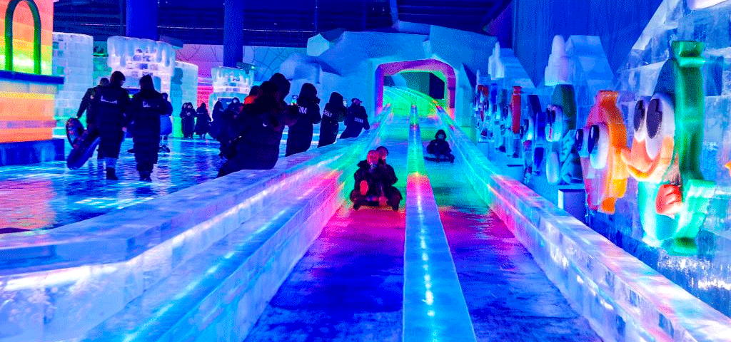 De acordo com o gerente do parque, a instalação possui nove áreas temáticas exibindo esculturas de gelo realistas com iluminação colorida. O parque temático mantém uma temperatura constante para receber visitantes durante todo o ano.