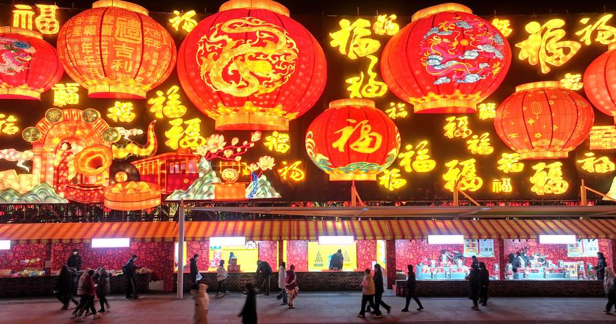 (240208) -- BEIJING, Feb. 8, 2024 (Xinhua) -- A drone photo taken on Feb. 7, 2024 shows people visiting a lantern show to celebrate the coming Spring Festival in the city of Tangshan, north China's Hebei Province. Many Chinese cities are adorned with illuminated lanterns as Spring Festival is around the corner. (Photo by Dong Jun/Xinhua)