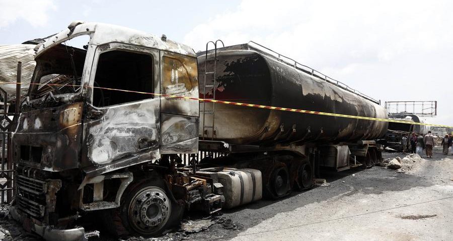 (250825) -- SANAA, Aug. 25, 2025 (Xinhua) -- A destroyed oil tankers is seen after it was struck by Israeli airstrikes on Sunday, in Sanaa, Yemen, Aug. 25, 2025. The death toll rose to six from Israeli airstrikes on Yemen's capital Sanaa, with 86 others wounded, the Houthi-run health ministry said Monday. (Photo by Mohammed Mohammed/Xinhua)