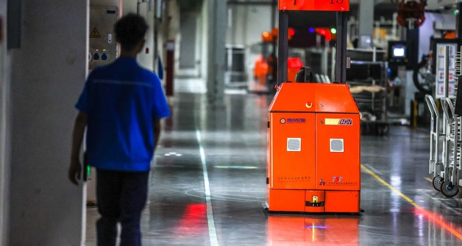 Veículo de guia automática opera em oficina totalmente equipada com 5G na Guizhou Tyre Co., Ltd., construída em conjunto com a filial da China Unicom, em Guiyang, Província de Guizhou, sudoeste da China. Foto: Ou Dongqu