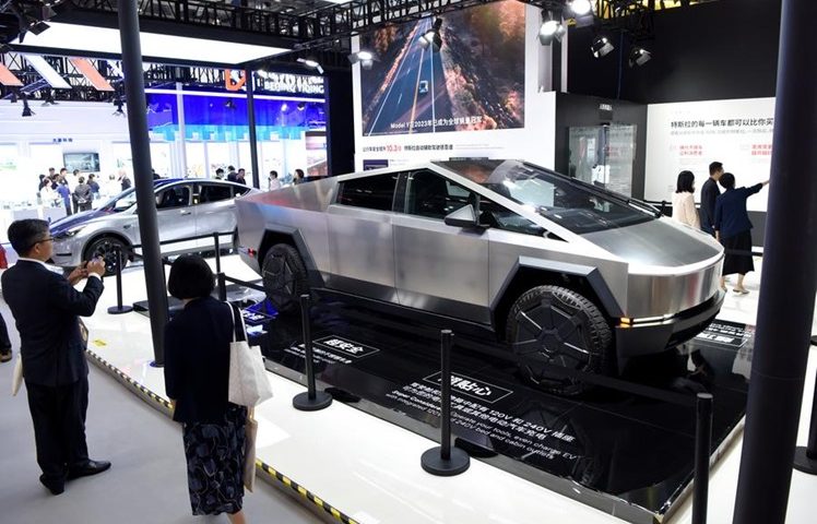 (240912) -- BEIJING, Sept. 12, 2024 (Xinhua) -- People visit the booth of Tesla during the 2024 China International Fair for Trade in Services (CIFTIS) at the China National Convention Center in Beijing, capital of China, Sept. 12, 2024. Themed "Global Services, Shared Prosperity," the 2024 CIFTIS opened at the China National Convention Center and the Shougang Park in Beijing on Thursday. (Xinhua/Wu Wei)