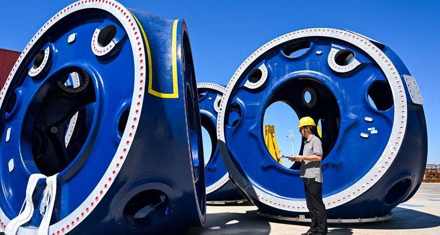 (250823) -- BAOTOU, Aug. 23, 2025 (Xinhua) -- A worker checks wind turbine components at the Mingyang New Energy Intelligent Manufacturing Industrial Park in Baotou, north China's Inner Mongolia Autonomous Region, July 29, 2025. Leveraging its abundant wind resources, the city of Baotou has stepped up to develop its onshore wind power equipment manufacturing business, aiming to build a full industrial chain that covers core component production and final assembly. (Xinhua/Li Zhipeng)