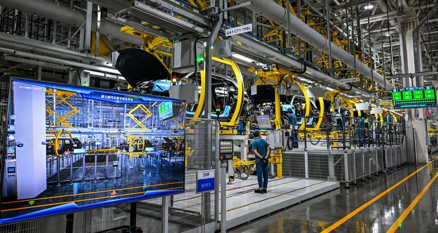 (250920) -- CHONGQING, Sept. 20, 2025 (Xinhua) -- This photo shows the automated production at the Seres Super Factory in Liangjiang New Area, southwest China's Chongqing, Sept. 19, 2025. As a major automotive manufacturing hub, Chongqing produced 1.659 million units in the first eight months of the year, up 7.6 percent year on year, while new energy vehicles (NEVs) production surged 31 percent to 690,000 units during the period. (Xinhua/Wang Quanchao)