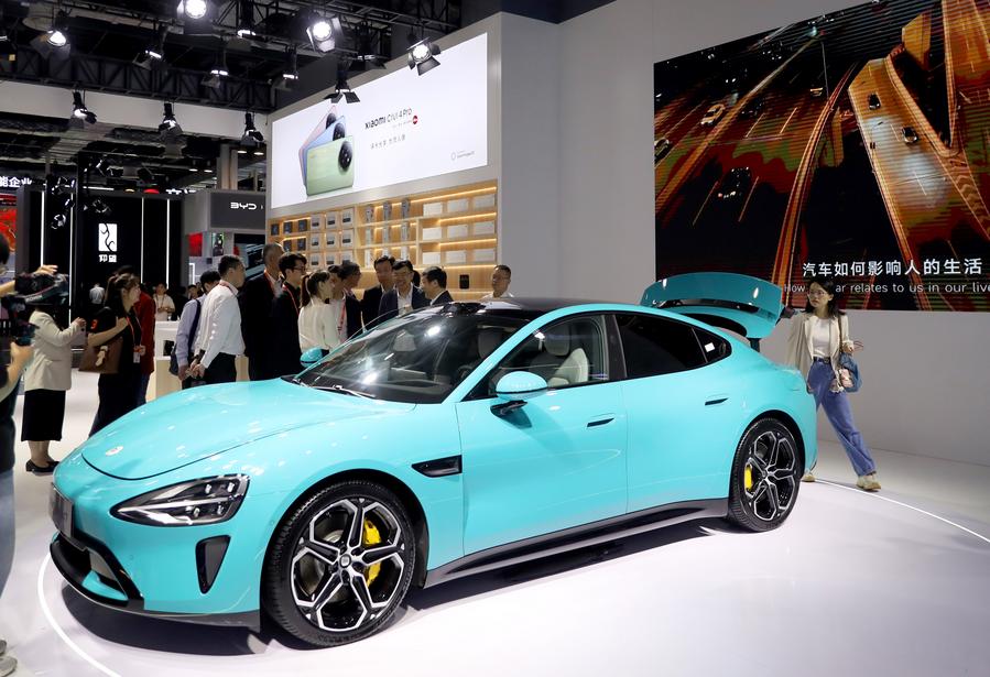 (240512) -- HEFEI, May 12, 2024 (Xinhua) -- Visitors look at a Xiaomi SU7 car on exhibition during the 2024 China Brand Day events in Shanghai, east China, May 10, 2024. (Xinhua/Fang Zhe)