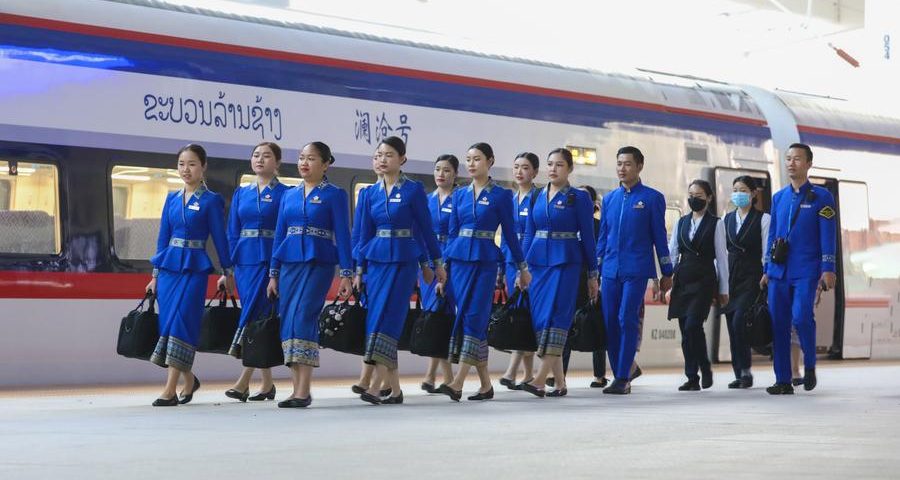 (240126) -- VIENTIANE, Jan. 26, 2024 (Xinhua) -- Crew members of the Lane Xang electric multiple unit (EMU) trains are seen at Vientiane Station of the China-Laos Railway in Vientiane, Laos, Jan. 26, 2024. The China-Laos Railway is witnessing its first Spring Festival travel rush since the railway started cross-border passenger services on April 13, 2023. (Photo by Yang Yongquan/Xinhua)