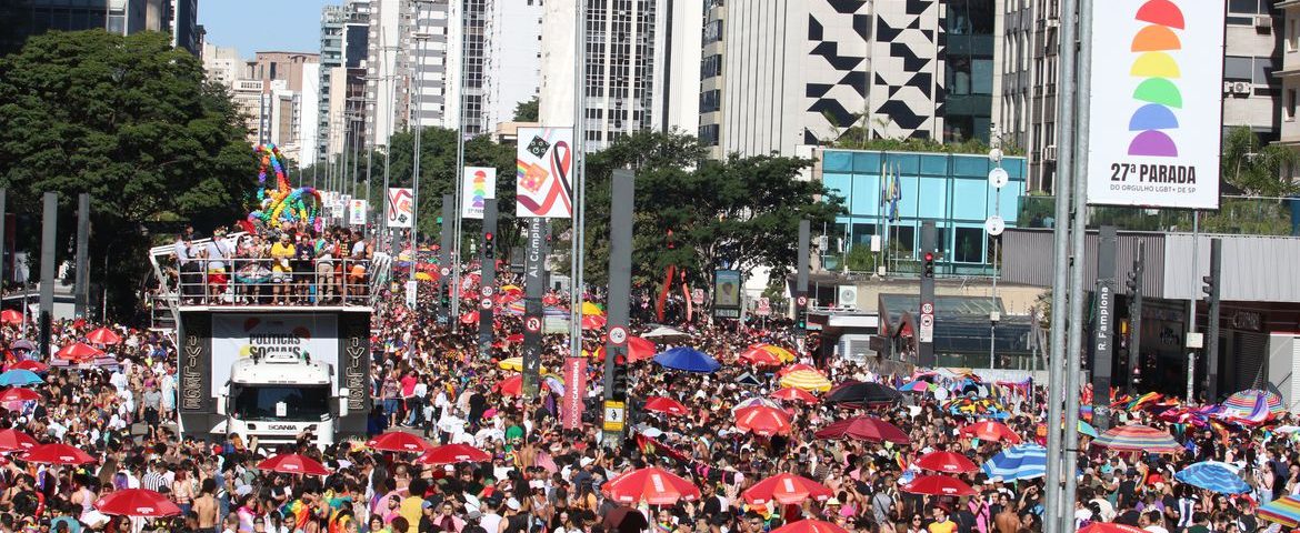 A Avenida Paulista, na região central da capital, está tomada pelo público da 27ª Parada do Orgulho LGBT desde a manhã deste domingo (11) ensolarado. Algumas pessoas chegaram enroladas na bandeira do arco-íris e outras fantasiadas, enquanto as tradicionais drag queens apostavam em visuais mais chamativos para a festa. Na programação dos trios elétricos, que descem a Rua da Consolação em direção ao centro da cidade, apresentam-se artistas como Pabllo Vittar, Daniela Mercury e Mc Soffia.