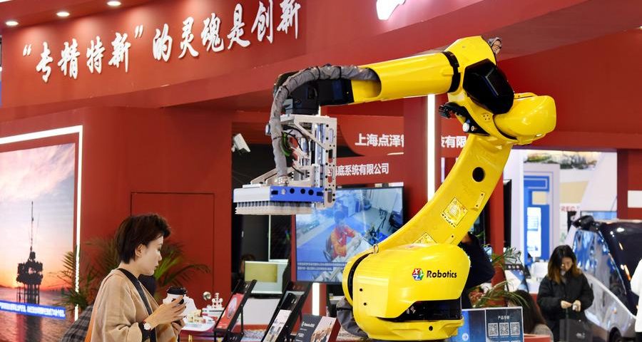 (231110) -- QINGDAO, Nov. 10, 2023 (Xinhua) -- People visit the 12th APEC Small and Medium Enterprises Technology Conference and Fair (APEC SMETC) in Qingdao, east China's Shandong Province, Nov. 10, 2023. Themed "Digital Innovation Drives Sustainable Development, Win-win Cooperation Aspires Greater Prosperity," this year's APEC SMETC, scheduled from Thursday to Saturday, will focus on multiple topics, such as the digital transformation of SMEs, technological innovation and development, green low-carbon development, artificial intelligence, and virtual reality, among others. Representatives of over 1,600 enterprises from the Asia-Pacific Economic Cooperation (APEC) member economies and the Belt and Road Initiative partner countries have joined the event. (Xinhua/Li Ziheng)