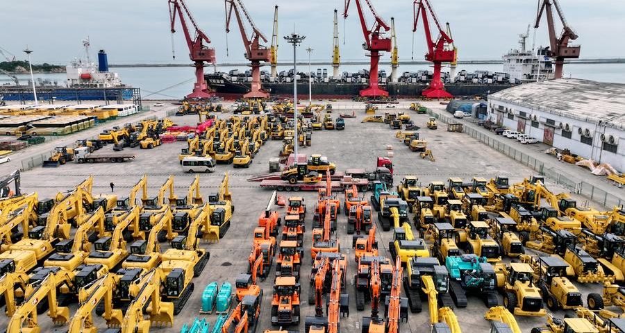 (240527) -- LIANYUNGANG, May 27, 2024 (Xinhua) -- A drone photo shows machinery at a port in Lianyungang City, east China's Jiangsu Province, May 27, 2024. China's industrial sector posted stronger growth momentum last month, with a sharp profit rebound suggesting sustained recovery. Profits of China's major industrial enterprises increased by 4 percent year on year in April 2024, reversing a 3.5 percent decline registered in the previous month, the National Bureau of Statistics (NBS) said Monday. Revenue growth of such enterprises also saw a turnaround with a 3.3 percent expansion recorded last month, compared to a 1.2 percent drop in March. (Photo by Wang Chun/Xinhua)