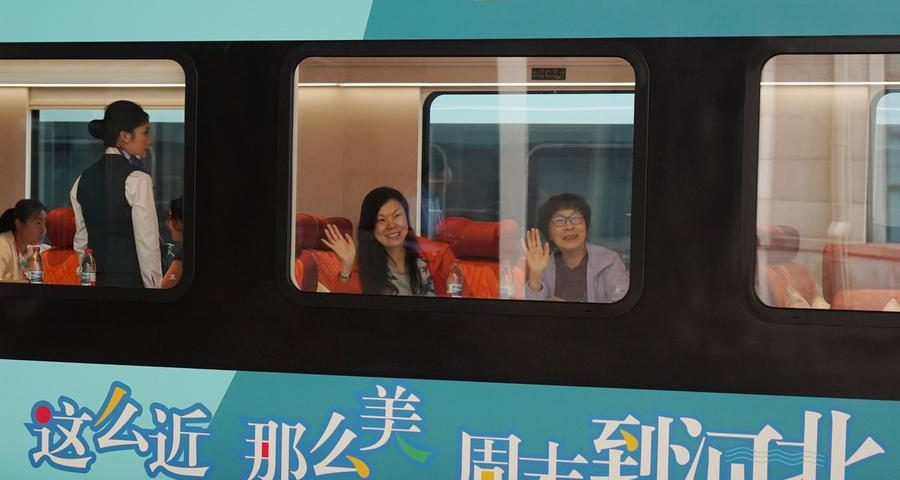(250710) -- BEIJING, July 10, 2025 (Xinhua) -- Passengers are pictured aboard a sightseeing tourist train bound for Chengde City in north China's Hebei Province, at Beijing Railway Station in Beijing, capital of China, July 9, 2025. The train, the first of its kind in the Beijing-Tianjin-Hebei region, departed from Beijing Railway Station on Wednesday. The conventional line of the train links China's capital city of Beijing and the city of Chengde in north China's Hebei Province. Equipped with seven carriages, which include a panoramic sightseeing carriage, a multi-functional entertainment carriage, a themed dining carriage and four sightseeing carriages, the train provides tourists with a mobile cultural space integrating sightseeing, dining and entertainment. (Xinhua/Zhang Chenlin)