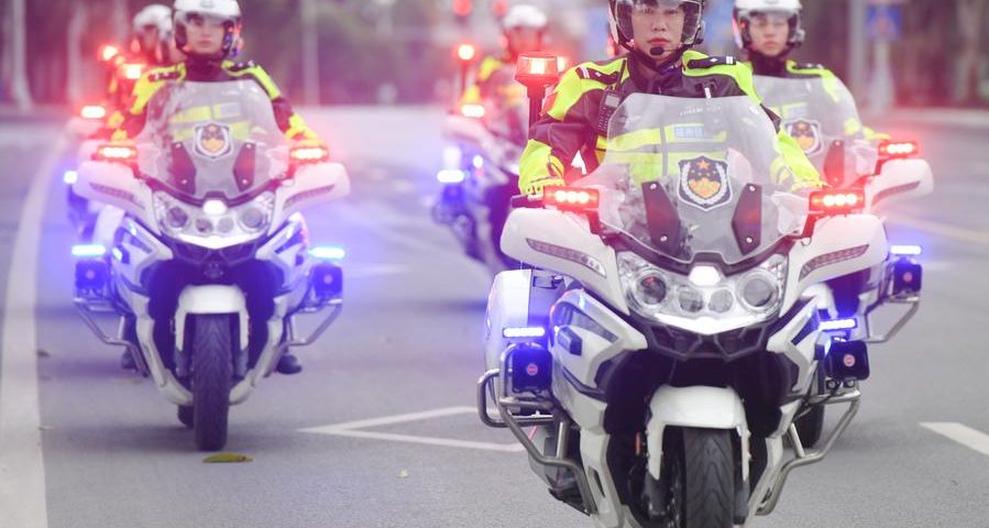 (210108) -- FUZHOU, Jan. 8, 2021 (Xinhua) -- Traffic policewomen driving motorcycles patrol on a road in Fuzhou City, southeast China's Fujian Province, Jan. 7, 2021. The city's first traffic policewomen motorcycle team was established days before the upcoming first Chinese police day that is set on Jan. 10, 2021. With an average height of up to 1.7 meters, those female motorcyclists in handsome uniforms are well-trained to be able to drive the about 300 Kg police motorcycle to perform duty, never failing to attract attentions wherever they go. One month ago, however, those young girls knowing nothing about motorcycling started just to receive strict heavy motorcycle ride training. Whatever the weather was, they were trained over eight hours a day. Their suffering and tenacity finally paid off and they were granted to perform duty on road. In recent years, many cities across China have built up traffic police motorcycle team due to its better mobility and flexibility in traffic management. (Xinhua/Song Weiwei)