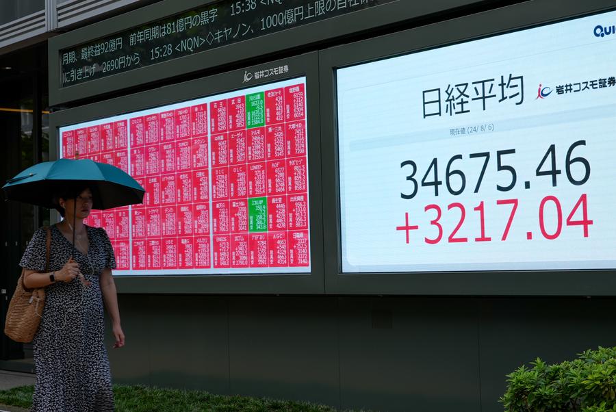 Pedestre passa por tela com informações do mercado de ações em tempo real em Tóquio, Japão, no dia 5 de agosto de 2024. (Xinhua/Yue Chenxing)