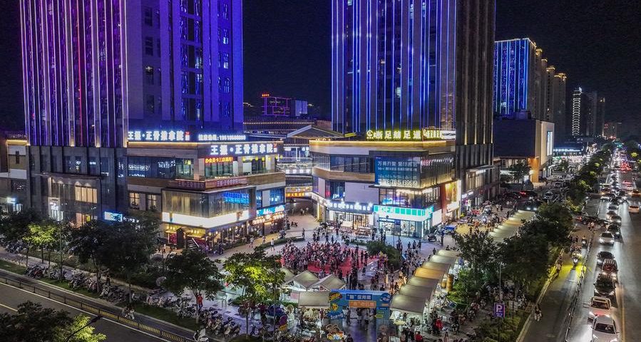 (250916) -- ZHUJI, Sept. 16, 2025 (Xinhua) -- An aerial drone photo taken on Sept. 16, 2025 shows a market set up next to the Zhuji city basketball center in Taozhu Street of Zhuji, east China's Zhejiang Province. A market has recently been set up next to the Zhuji city basketball center, a venue for ZheBA, Zhejiang's province-wide community basketball league. The market serves as a multi-business platform which combines sports, shopping and catering. (Xinhua/Xu Yu)
