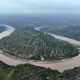 (250918) -- ZHENGZHOU, Sept. 18, 2025 (Xinhua) -- An aerial photo taken on July 24, 2025 shows a turning of the Yellow River in the border area between Shilou County of north China's Shanxi Province and Qingjian County of northwest China's Shaanxi Province. TO GO WITH "China Focus: Yellow River maintains good water quality for 3 consecutive years" (Xinhua/Zhan Yan)