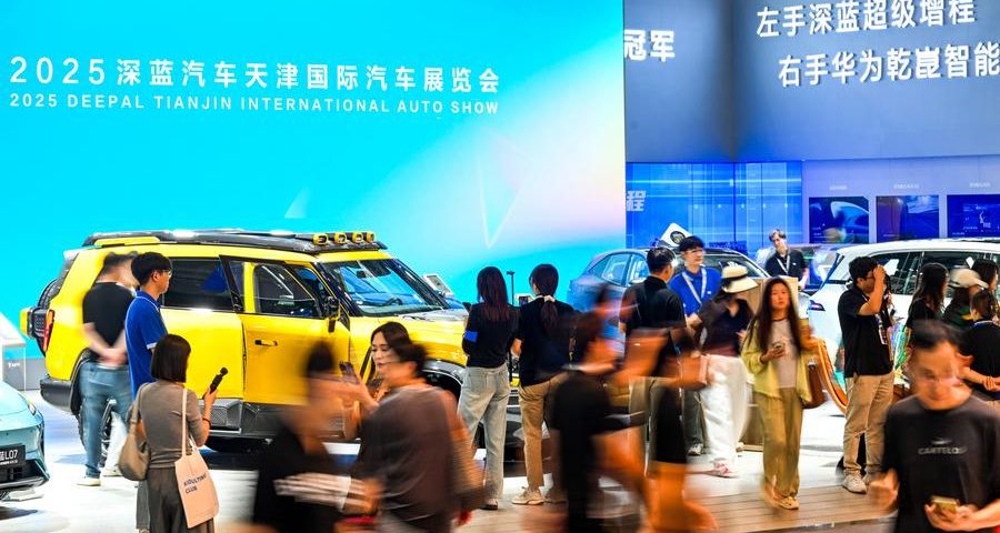 (250930) -- TIANJIN, Sept. 30, 2025 (Xinhua) -- People visit the booth of Deepal during the China Motor Show (Tianjin) 2025 in north China's Tianjin, Sept. 30, 2025. China Motor Show (Tianjin) 2025 kicked off here on Tuesday. With a total exhibition area of 200,000 square meters, the auto show displays 920 vehicles, including 480 new energy vehicles. The exhibition will run until October 6. (Xinhua/Zhao Zishuo)