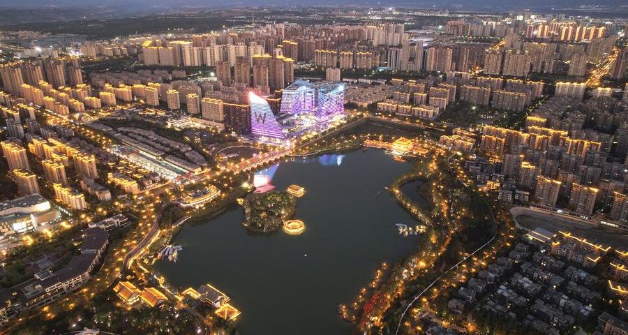 (230512) -- XI'AN, May 12, 2023 (Xinhua) -- This aerial photo taken on June 14, 2022 shows a view of the Qujiang New District in Xi'an, northwest China's Shaanxi Province. Relying on rich historical and cultural resources, Xi 'an, a city with over 3,100 years of history, by integrating the culture and tourism, promotes and boosts new consumption model to inject new vitality into urban life. (Xinhua/Shao Rui)