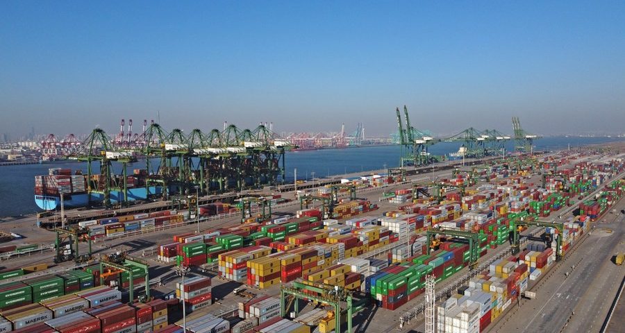 Foto aérea tirada em 18 de dezembro de 2021 mostra uma vista do terminal internacional de contêineres do Pacífico no Porto de Tianjin, no Município de Tianjin, norte da China. (Xinhua/Zhao Zishuo)