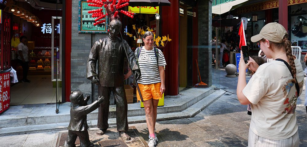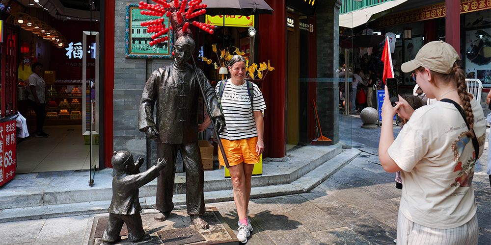 Turista suíça posa para foto na Rua Qianmen em Beijing, capital da China, no dia 10 de julho de 2024. (Xinhua/Ju Huanzong)