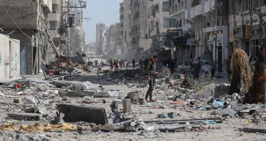 (240401) -- GAZA, April 1, 2024 (Xinhua) -- People are seen on a street with damaged buildings near the Shifa Hospital in Gaza City, on April 1, 2024. The Israeli army on Monday withdrew from the Shifa Hospital in Gaza City after two weeks of military operation, leaving dozens of deaths and massive destruction, Palestinian security medical sources said. (Photo by Mohammed Ali/Xinhua)
