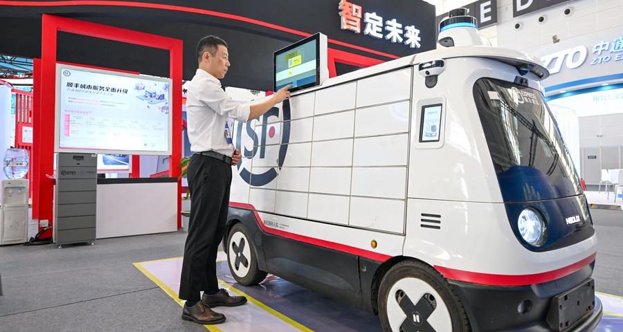 (240623) -- TIANJIN, June 23, 2024 (Xinhua) -- An exhibitor operates an unmanned autonomous delivery vehicle for courier service displayed at the World Intelligence Expo 2024 in north China's Tianjin, June 20, 2024. The ongoing expo showcases intelligent connected new-energy vehicles (NEVs), architecture platforms, as well as simulation and testing platforms developed by automotive manufacturers, universities and other institutions from home and abroad. (Xinhua/Sun Fanyue)