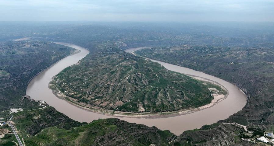 (250918) -- ZHENGZHOU, Sept. 18, 2025 (Xinhua) -- An aerial photo taken on July 24, 2025 shows a turning of the Yellow River in the border area between Shilou County of north China's Shanxi Province and Qingjian County of northwest China's Shaanxi Province. TO GO WITH "China Focus: Yellow River maintains good water quality for 3 consecutive years" (Xinhua/Zhan Yan)