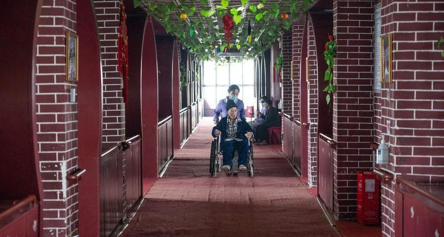 (201013) -- BEIJING, Oct. 13, 2020 (Xinhua) -- A medical worker helps a disabled elderly man on a wheelchair go back to his room at Longhui-weiyuan hospital in Longhui County, central China's Hunan Province, Oct. 12, 2020. The hospital set up the geriatric unit in 2010, which provides nursing, rehabilitation, entertainment and food services to elderly residents. (Xinhua/Cai Yang)