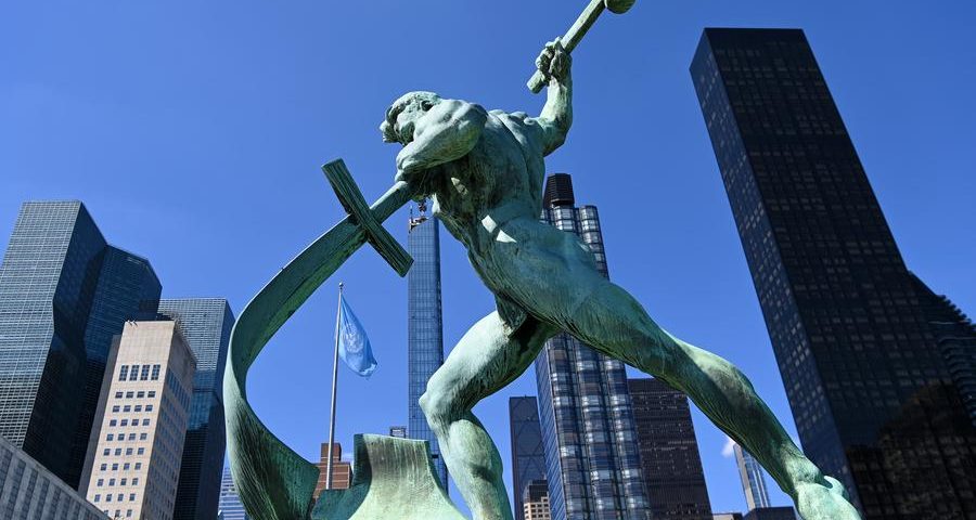 Pessoas passam por escultura intitulada “Sem Violência” na sede das Nações Unidas em Nova York, 18 de setembro de 2025. (Xinhua/Li Rui)