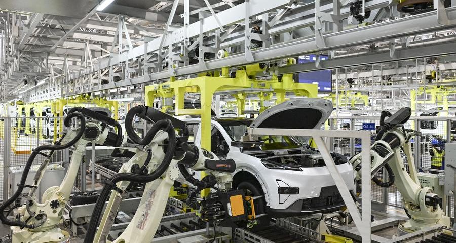 (250110) -- CHONGQING, Jan. 10, 2025 (Xinhua) -- An automatic assembly line is pictured at a smart factory of Changan Auto in Chongqing, southwest China, Jan. 9, 2025. Chongqing, a key hub of the country's automotive industry, boasts a complete auto industrial chain and has registered a rapid growth in new energy vehicle (NEV) production in recent years. (Xinhua/Wang Quanchao)