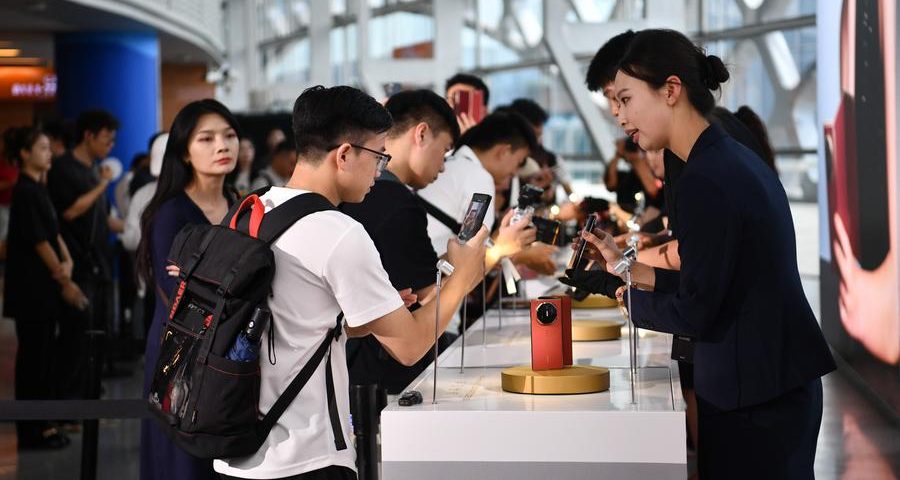 (240910) -- SHENZHEN, Sept. 10, 2024 (Xinhua) -- People try out Huawei smartphones in Shenzhen, south China's Guangdong Province, Sept. 10, 2024. China's technology giant Huawei unveiled the world's first commercial tri-fold smartphone, the Mate XT, during a new products release event here Tuesday. A new edition of Aito M9 and newly released Luxeed R7, both powered by Huawei's Harmony Intelligent Mobility Alliance (HIMA), were also released during the event. (Xinhua/Liang Xu)