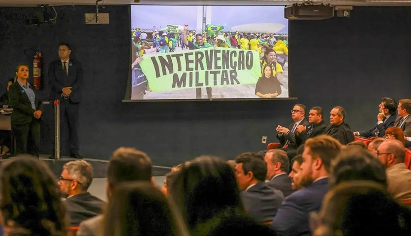 Um vídeo com cenas da “batalha campal”, como descreveu o ministro, foi colocado durante a sessão da Primeira Turma do Supremo, colegiado responsável por julgar o caso. Para rebater as alegações de falta de provas, Moraes apresentou, na parte final de seu voto, uma tabela relacionando dos os atos apontados pela PGR como criminosos e todas as provas documentais colhidas pela Polícia Federal (PF).