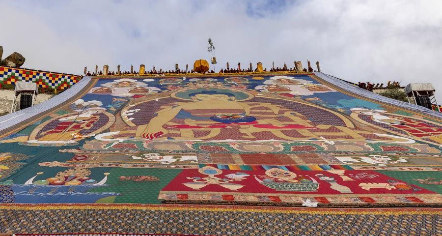 Por volta das 7 da manhã, cerca de 100 monges do Mosteiro de Drepung, em Lhasa, carregaram para o ar livre a enorme pintura thangka enrolada de Buda e depois a espalharam em uma plataforma na encosta para tomar sol, o que sinalizou o início do festival.