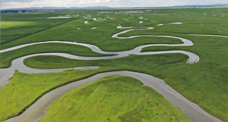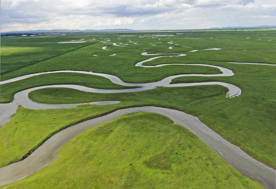 (250918) -- ZHENGZHOU, Sept. 18, 2025 (Xinhua) -- An aerial photo taken on July 24, 2025 shows a turning of the Yellow River in the border area between Shilou County of north China's Shanxi Province and Qingjian County of northwest China's Shaanxi Province. TO GO WITH "China Focus: Yellow River maintains good water quality for 3 consecutive years" (Xinhua/Zhan Yan)